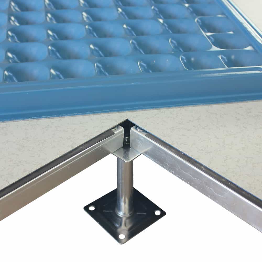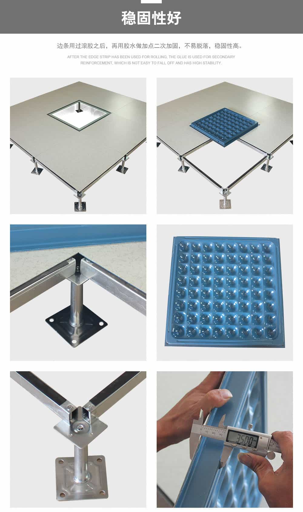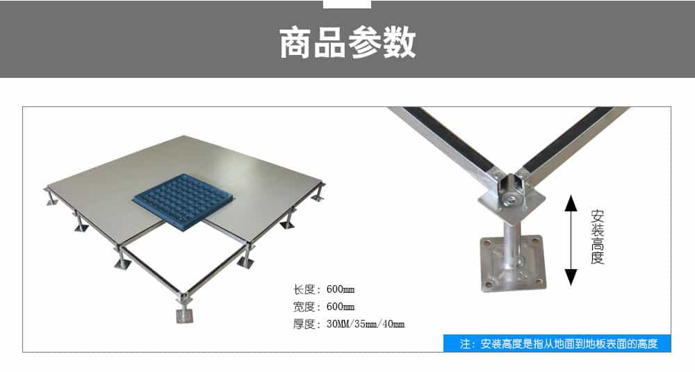 全鋼防靜電地板為全鋼組件,分有邊、無邊、微邊(三種邊處理方式)。底面采用SPCC深沖冷軋板拉伸成型鋼板厚度(0.4~1.5mm),球窩狀結(jié)構(gòu),增加地板的機(jī)械荷載強(qiáng)度。面板采用硬質(zhì)SPCC鋼板(0.5~2.0mm),上下經(jīng)過點(diǎn)焊焊接成型,切邊沖孔后,經(jīng)防銹處理,環(huán)氧樹脂粉末靜電噴涂后,中間填充發(fā)泡水泥(可以根據(jù)客戶需求發(fā)泡不同重量),再經(jīng)過日曬養(yǎng)護(hù)后形成穩(wěn)定的承載結(jié)構(gòu)。地板上表層粘貼防火板(HPL)/復(fù)合PVC/ 通體PVC/陶瓷地磚等不同材質(zhì)的裝飾表層,達(dá)到產(chǎn)品花色的多樣性、可以根據(jù)客戶需求個(gè)性化定制產(chǎn)品。搭配聯(lián)網(wǎng)支架、支架、螺釘組裝后,定位聯(lián)接更加準(zhǔn)確、精度可靠。